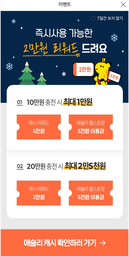 3. ์ ์๋ฆฌ๋ ์บ์๋ฅผ ์ถฉ์ ํ๋ฉด 10๋ง ์์ ์ต๋ 1๋ง ์, 20๋ง ์์ ์ต๋ 2๋ง 5์ฒ ์์ ํํ์ ๋ณผ ์ ์์ด์.